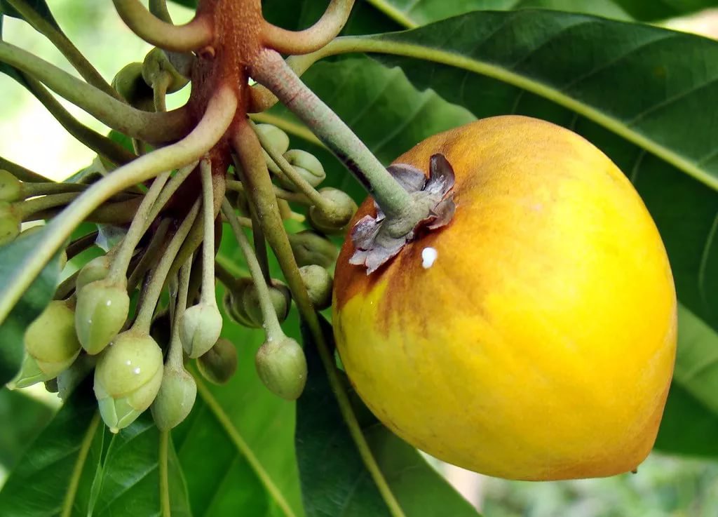 Сами фрукты, в зависимости от сорта, могут иметь абсолютно разные формы: круглые, овальные, с искривленным клювом, веретенообразные. Часто их сравнивают по внешнему виду с мелкими манго. Размер плода колеблется от 7см до 12 см. Лучшие сорта весят около 400 г.